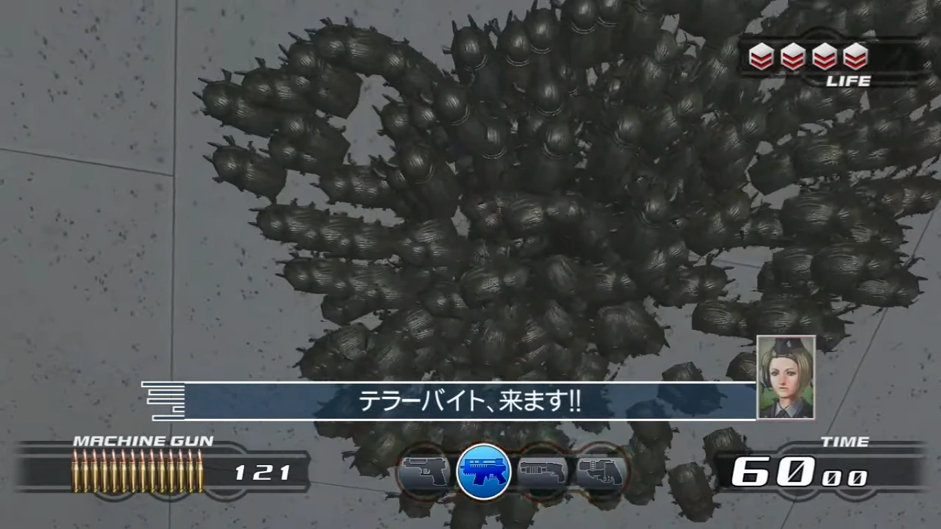 遺 伝 子 改 造 された生 物 兵 器 (通 称 テラーバイト:Terror Bites)" meaning "the genetically modified creatures are known as Terror Bites" - ↑ Time Crisis 4 official site, Beetle Bites details
